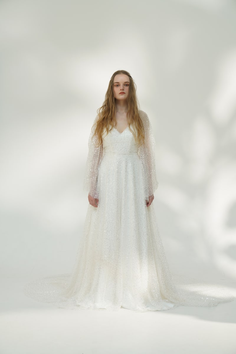 オーバードレスには、ビーディングが施されておりまるで宝