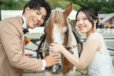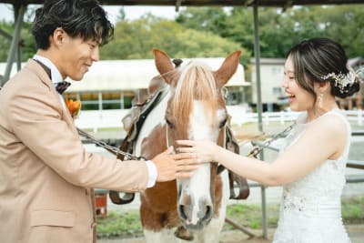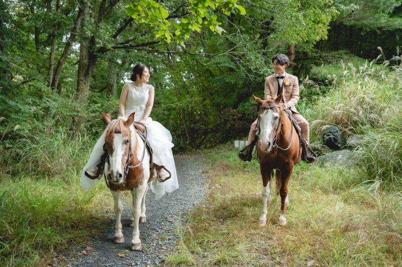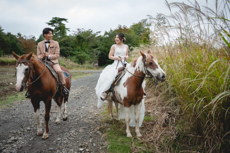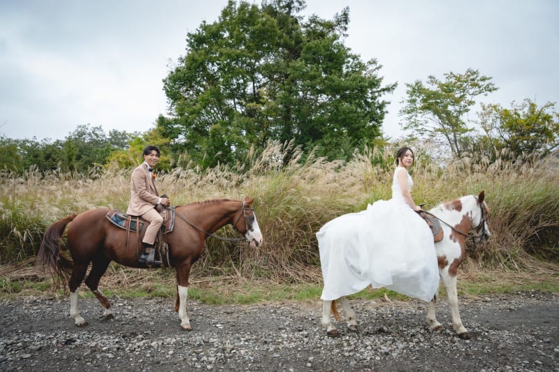 こんにちは!スタジオAQUA浅草店でございます。自然豊かなロケーションの中で乗馬を楽しめる富士での撮影をご紹介します!乗馬は初挑戦だというお二人のとても楽しそうなショットがたくさん撮れました!