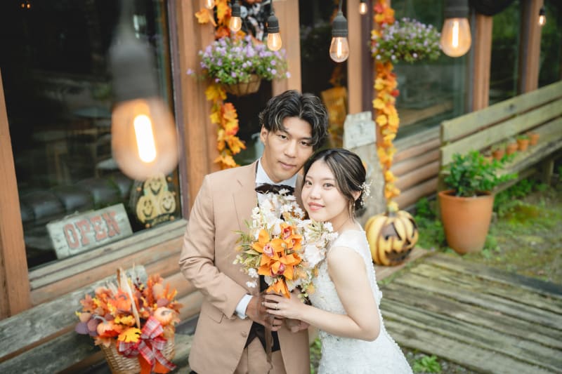 季節感を感じるハロウィンの飾りをバックにカメラ目線の一枚で撮影を結びました!