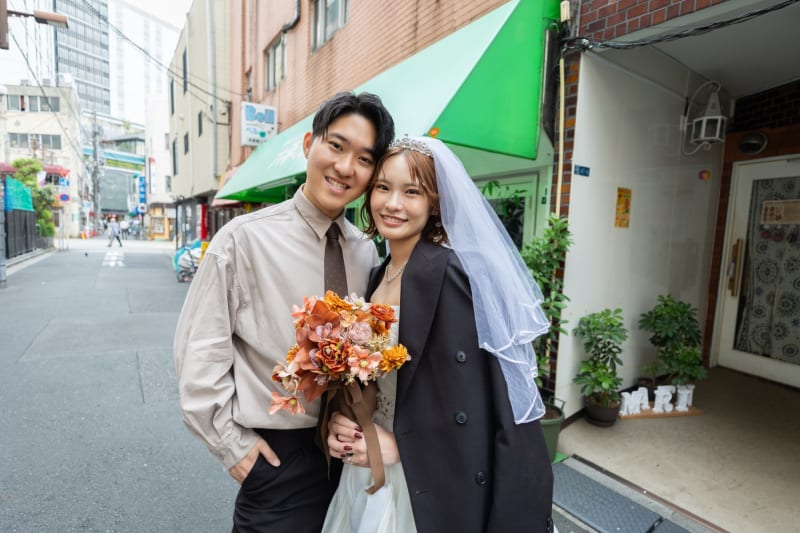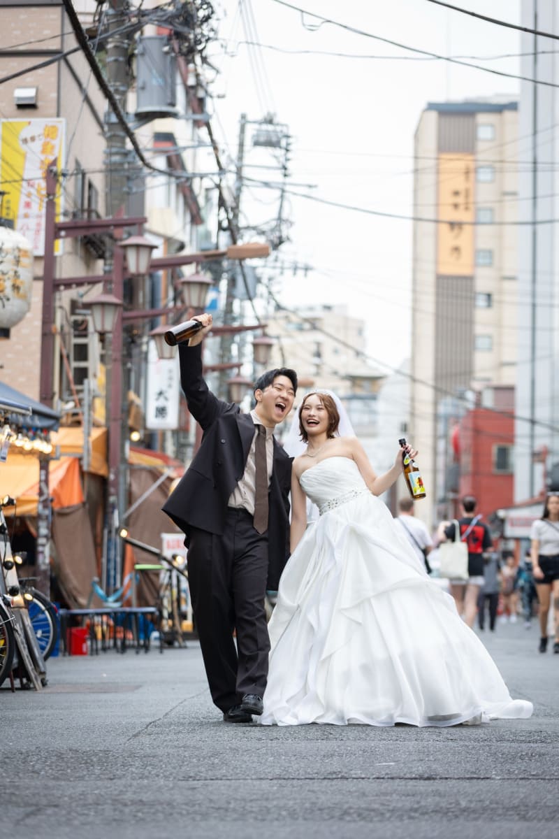 お酒好きなお二人ならではの特別な一枚! お好きなお酒を持って、ホッピー通りでリラックスしながら撮影しました!