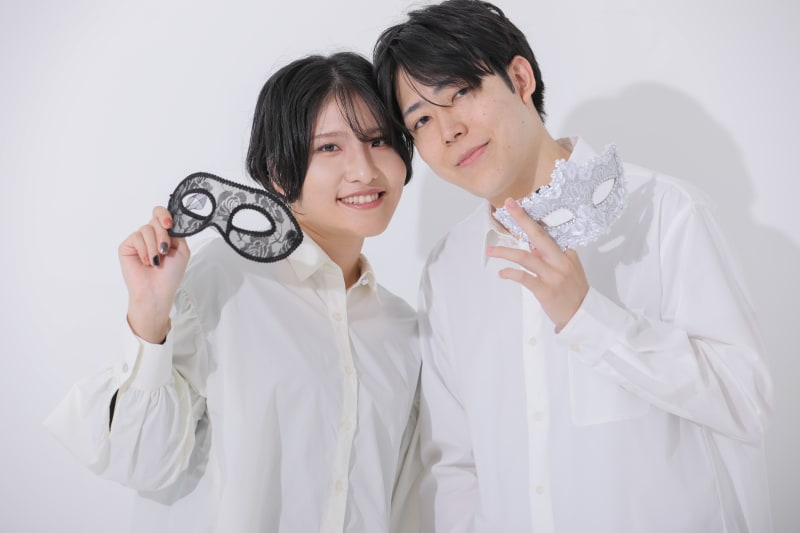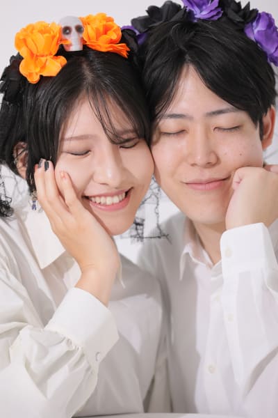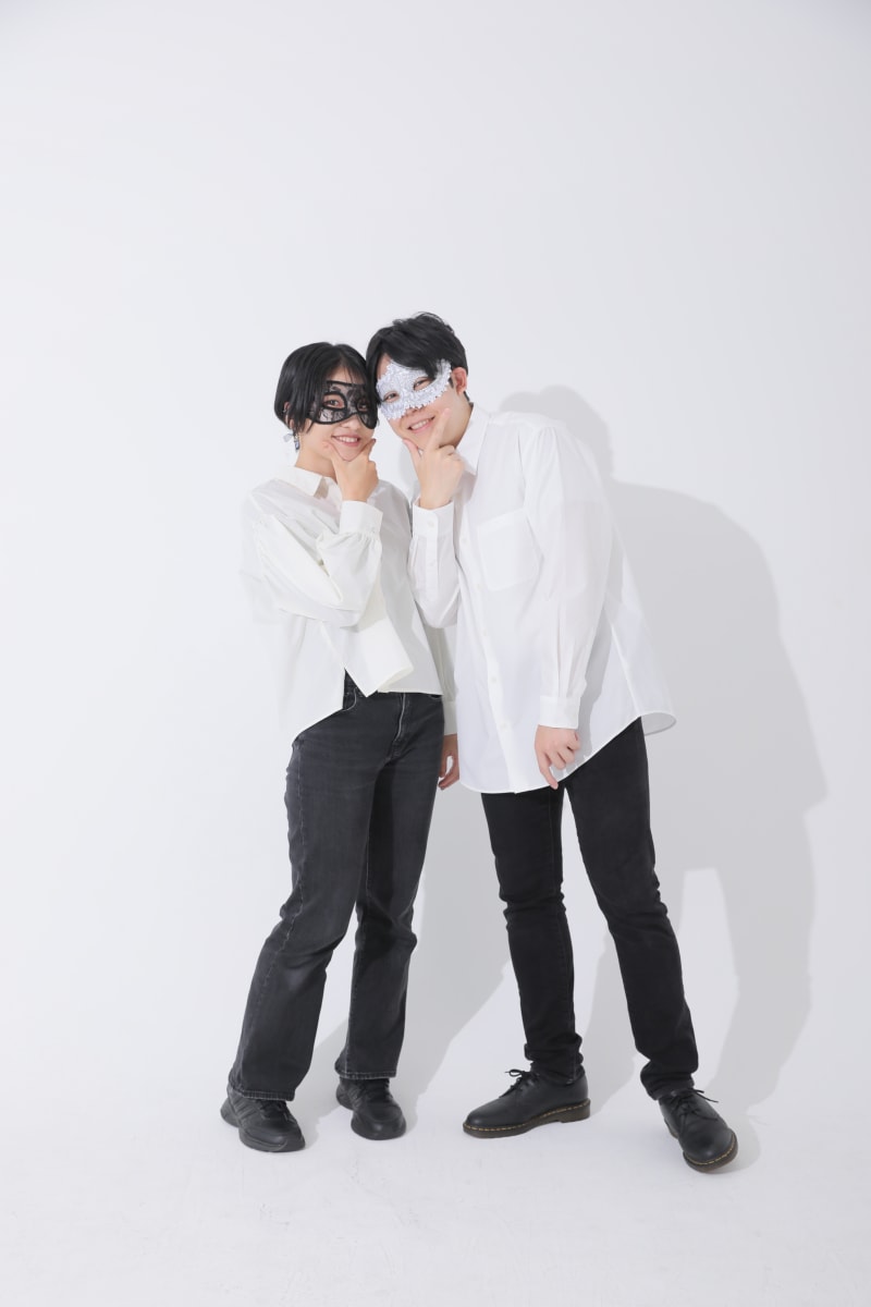 撮影日はハロウィン!仮装アイテムをいくつか持ってきてくださっていました!ゴージャスな仮面をつけて決めるお二人。