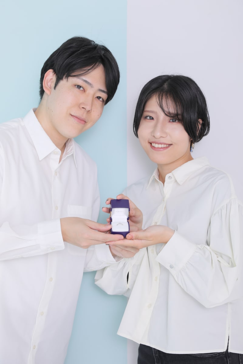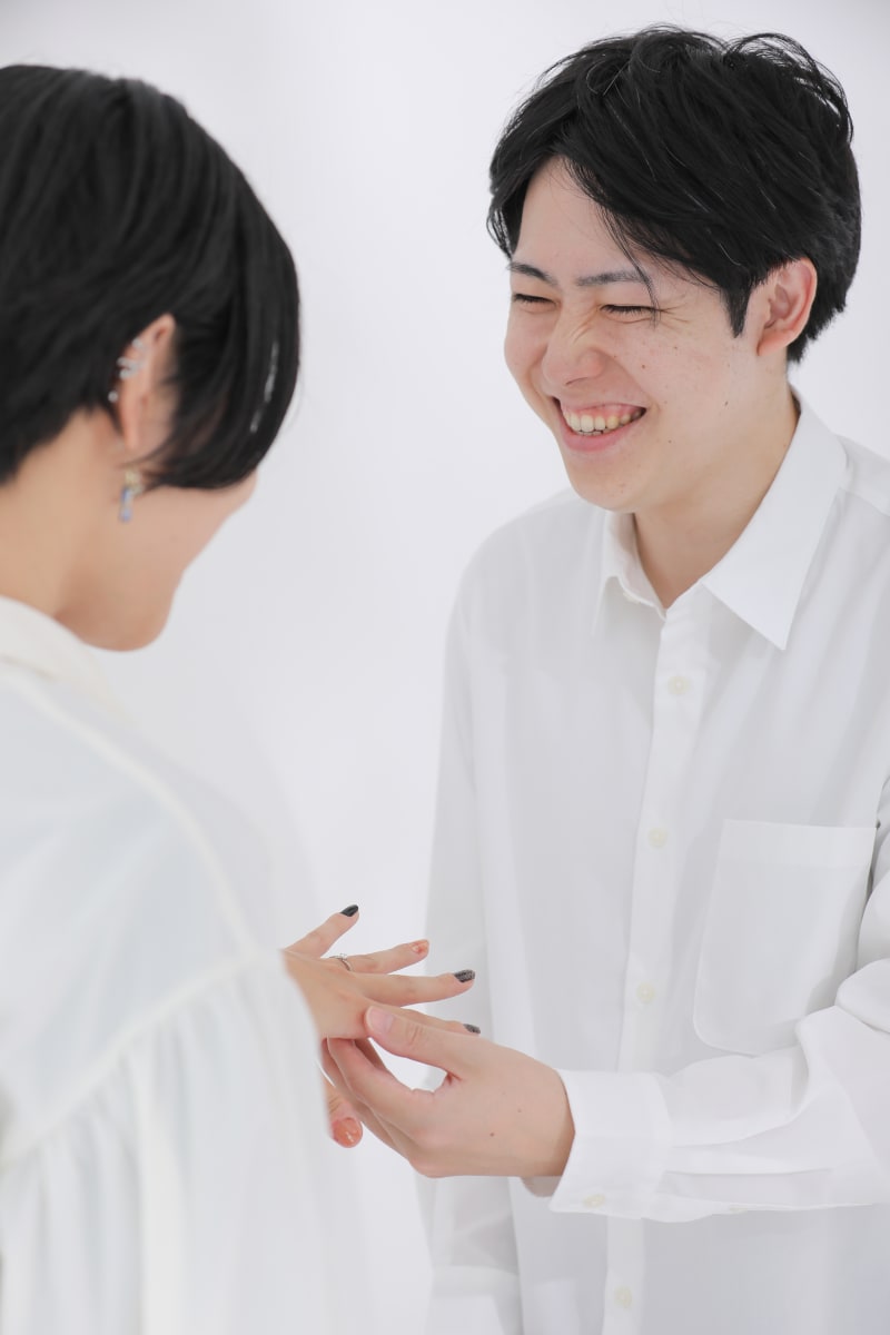 婚約指輪を彼女の指へ。きらりと輝いています。自然と溢れた笑顔がとても素敵でした。