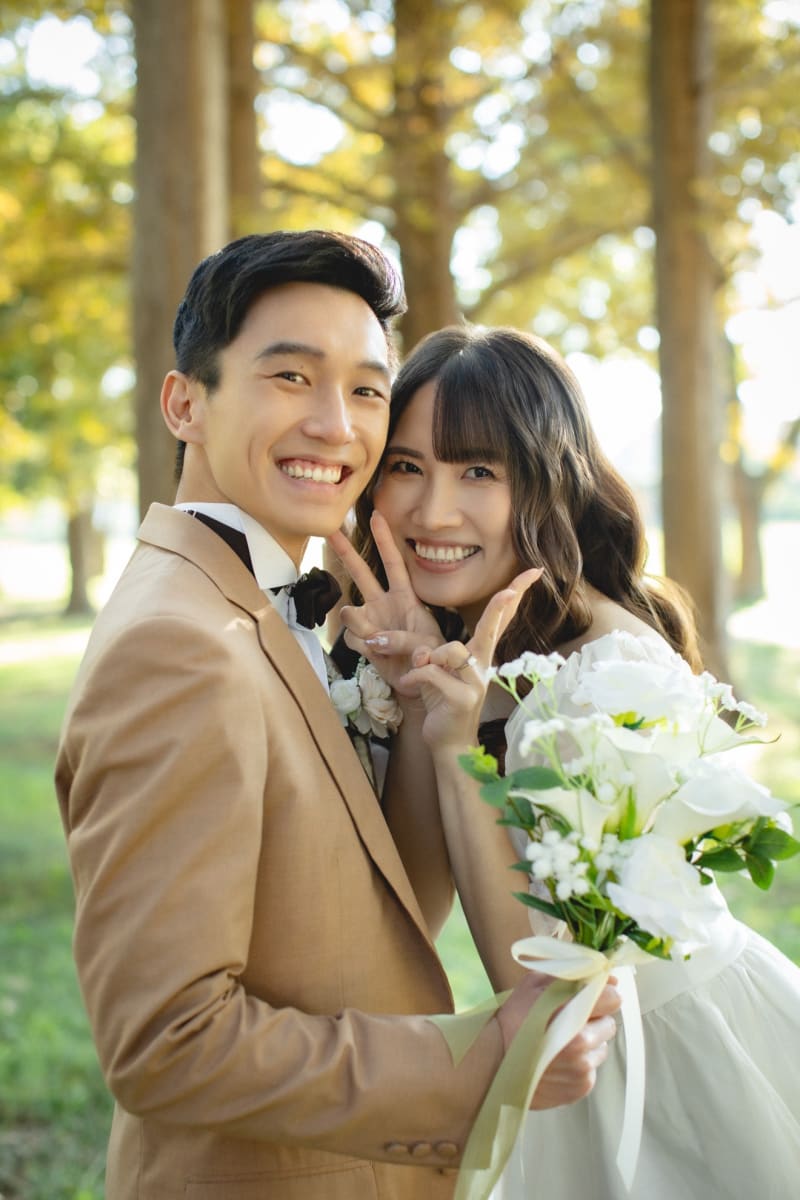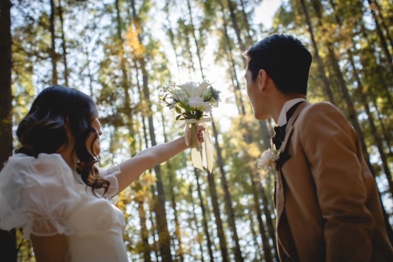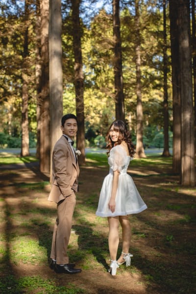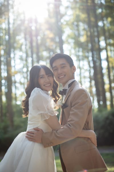 メタセコイヤエリアでは、まるで海外のようなロケーションで撮影することができます。温かい光がお二人を包み込みます。
