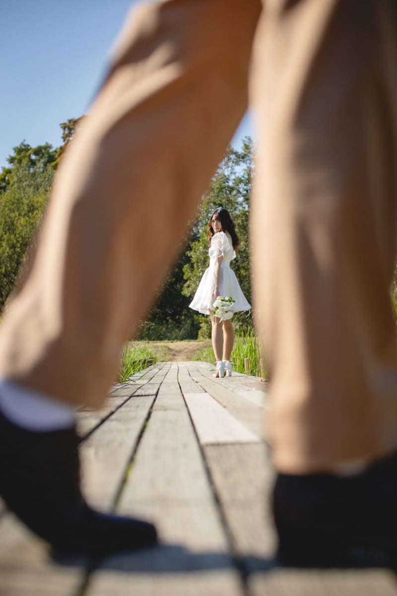 新婦様のソロカット。新郎様の足元から撮影した大胆な構図です。振り向く新婦様がとても可愛いですね。