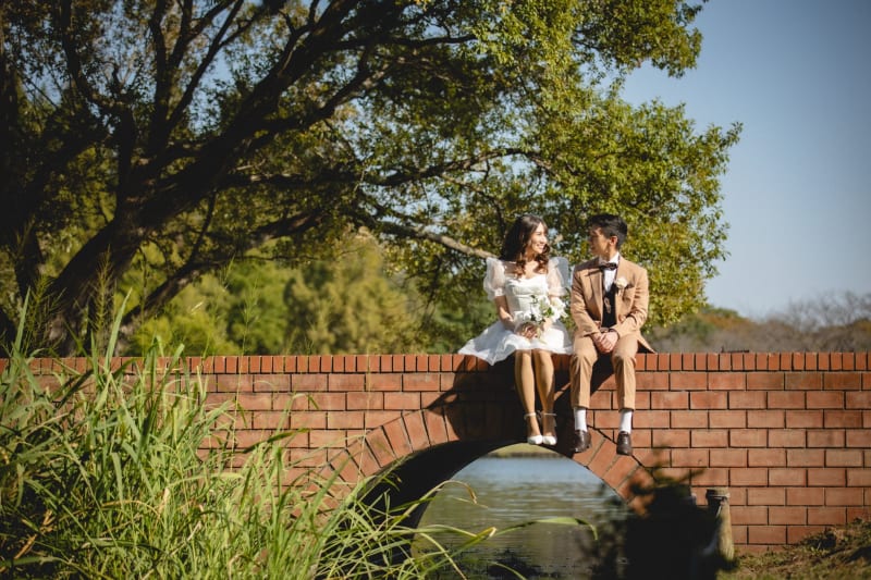 レンガ作りの橋に腰掛けるお二人。デートのワンシーンのようにお話ししていただきました。