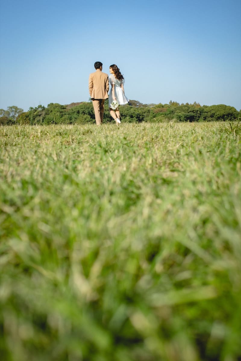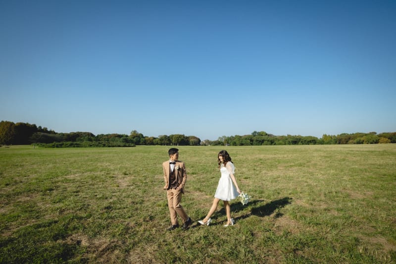 芝生が広がる中央公園エリアへ移動。天気の良い日には青空が広がる開放的な空間です。お散歩するお二人の様子をカメラに収めました。