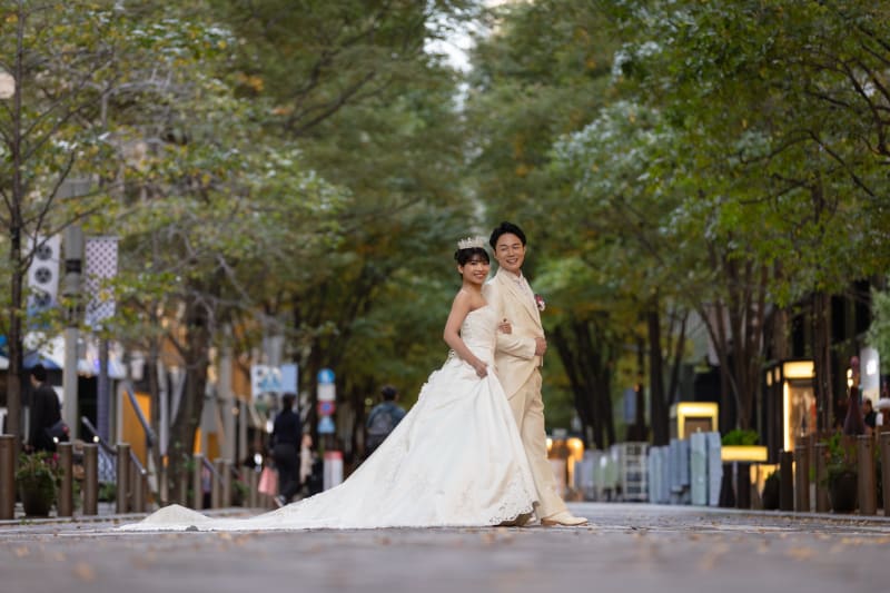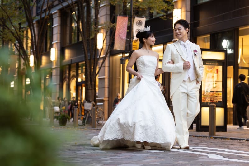 丸の内通りへと続く道を、ゆっくりと歩き始めたおふたり。カメラ目線もバッチリです。