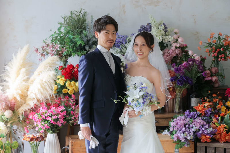 カラフルなお花に囲まれて撮影することで、白ドレスがより一層映えますね!