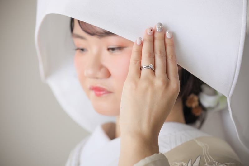 綿帽子を着用した新婦様。指輪を主役にソロカットを撮影しました。