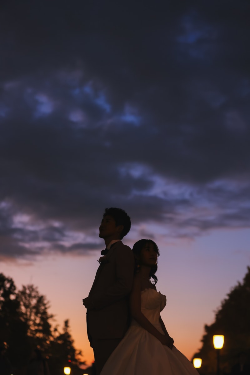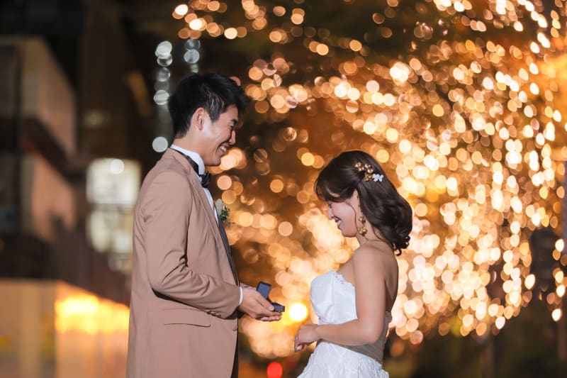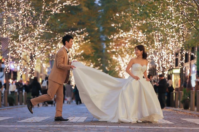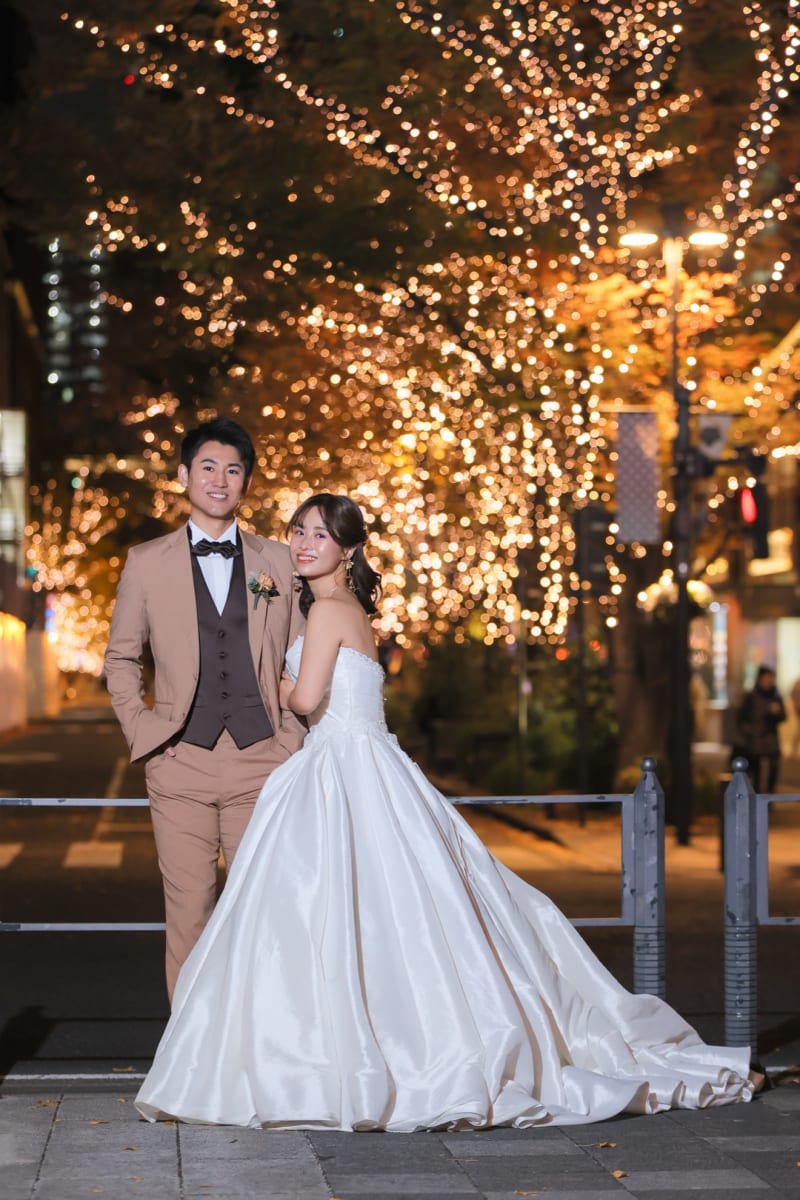 イルミネーションの光に彩られた撮影日。寒い中でも、おふたりが寄り添う姿はまるで温もりそのものでした。