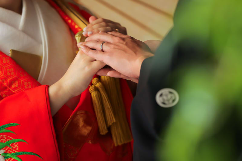 そっと手を重ねながら、 ご新婦様から番傘を受け取ろうとするご新郎様。