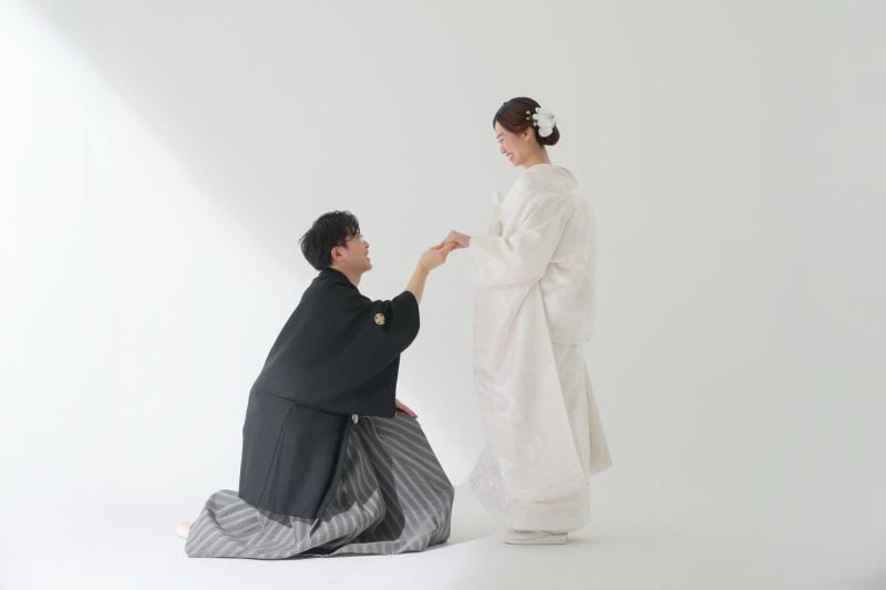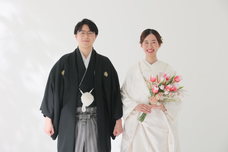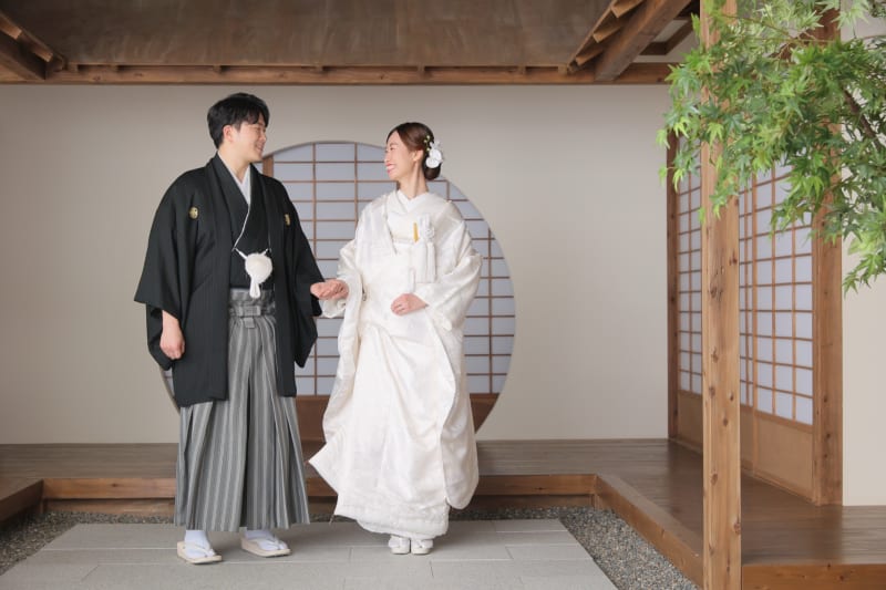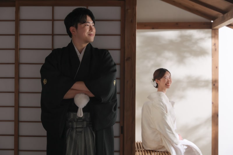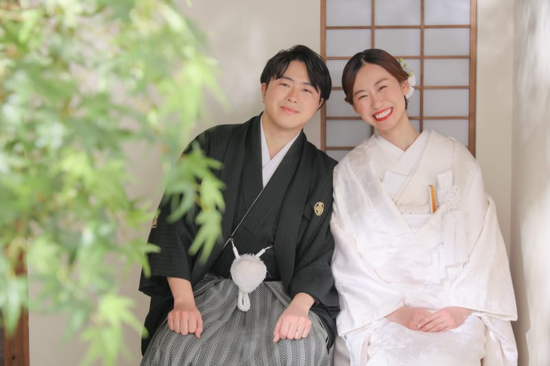 こんにちは、スタジオAQUA浅草店の芹田です!屋内庭園スタジオとシンプルな白背景の2箇所で撮影されたお二人のご紹介です。まずは本格的な庭園風のスタジオから。