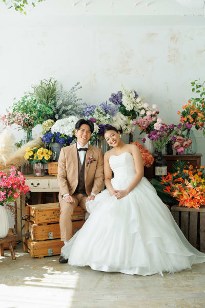 中でも人気なのが、まるでお花屋さんのような色とりどりのお花に囲まれた背景。華やかで可愛らしく、ドレスとの相性も抜群です。