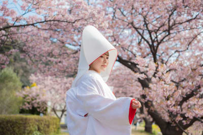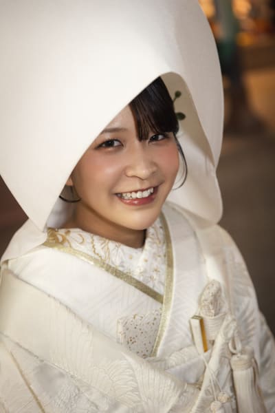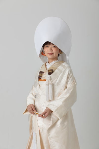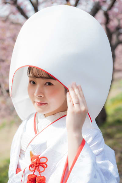 綿帽子には「顔を隠すことで魔よけになる」「挙式を終えるまで新郎以外の人に顔を見られないようにする」という意味が。ウエディングベールと似たような役割もあります。