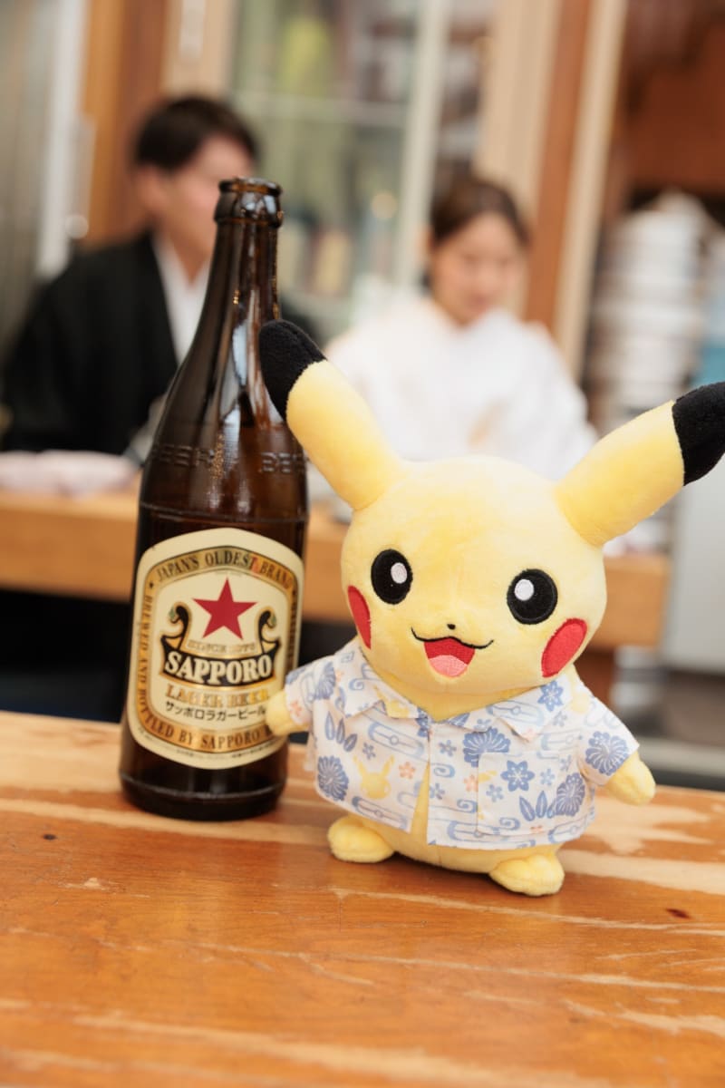 テーブルの上には、ビンビールとアロハシャツを着たピカチュウのぬいぐるみ。