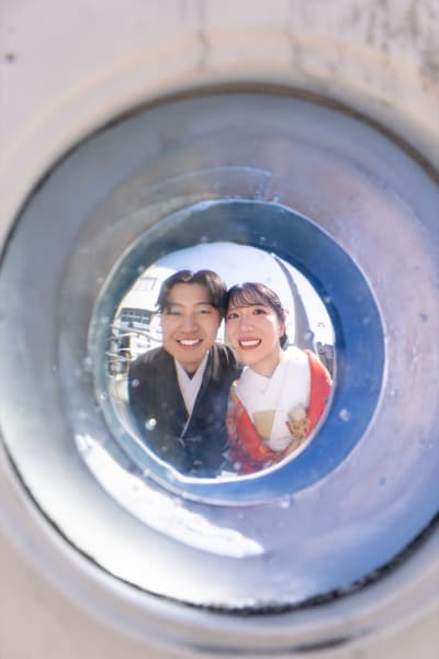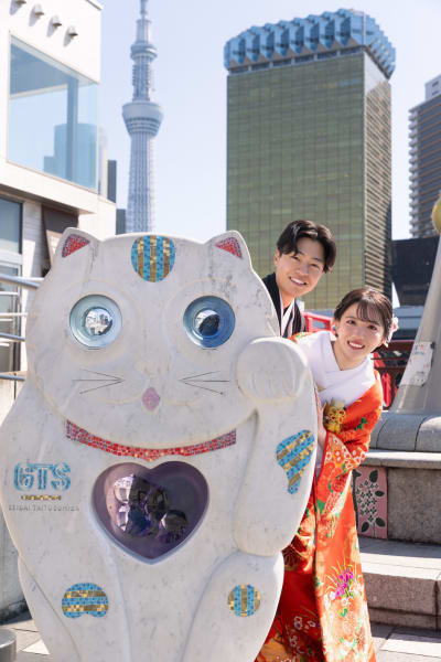 招き猫の目をよく見るとレンズのようになっていました!覗くとおふたりの素敵な笑顔が見えました。