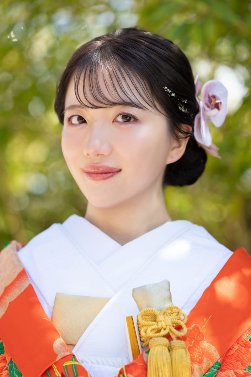 胡蝶蘭の髪飾りが印象的なヘアセット。