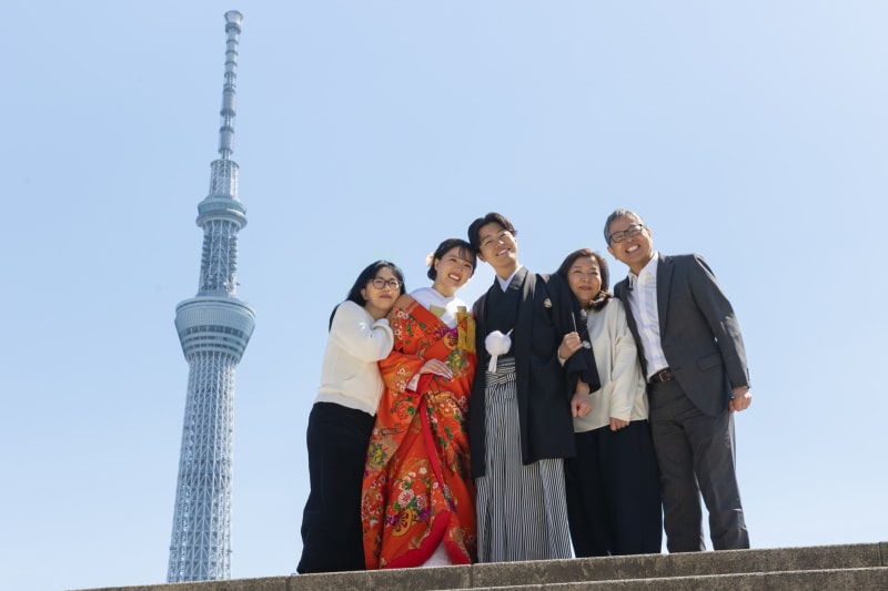 スカイツリーをバックに紅白の和傘を使用して撮影。