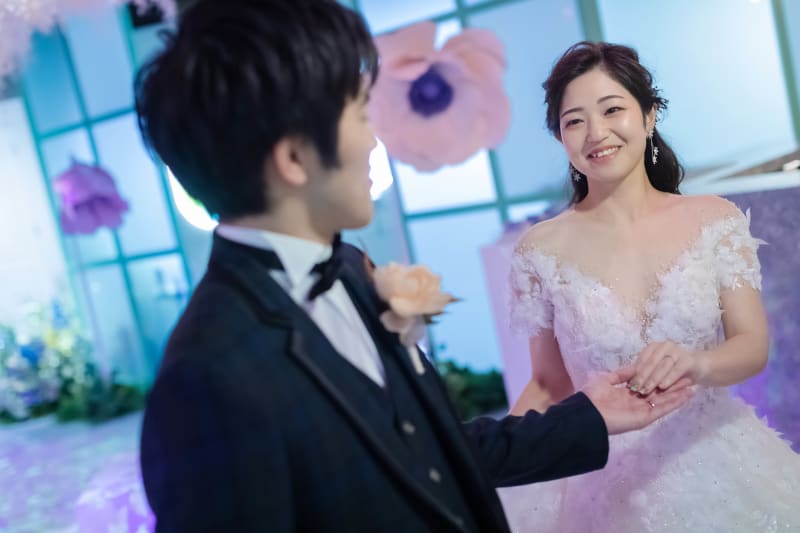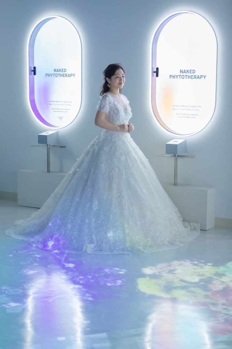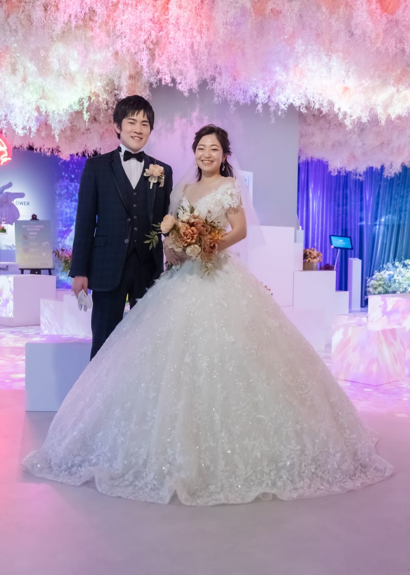 撮影場所のネイキッドフラワーの照明と、韓国ドレスの輝きがとても良く合い、さらに輝きが増してきれいです!!