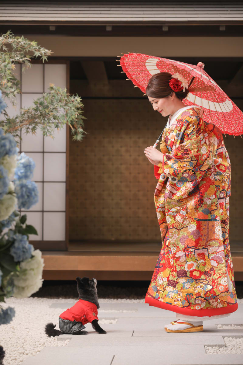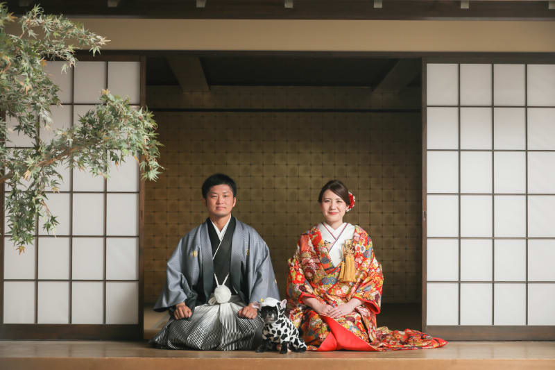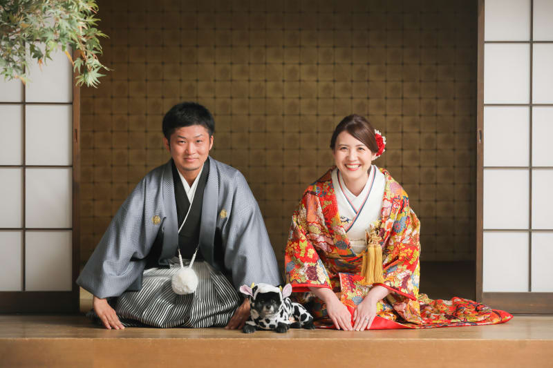 旦那様とお揃いの赤い紋服で和装ショット