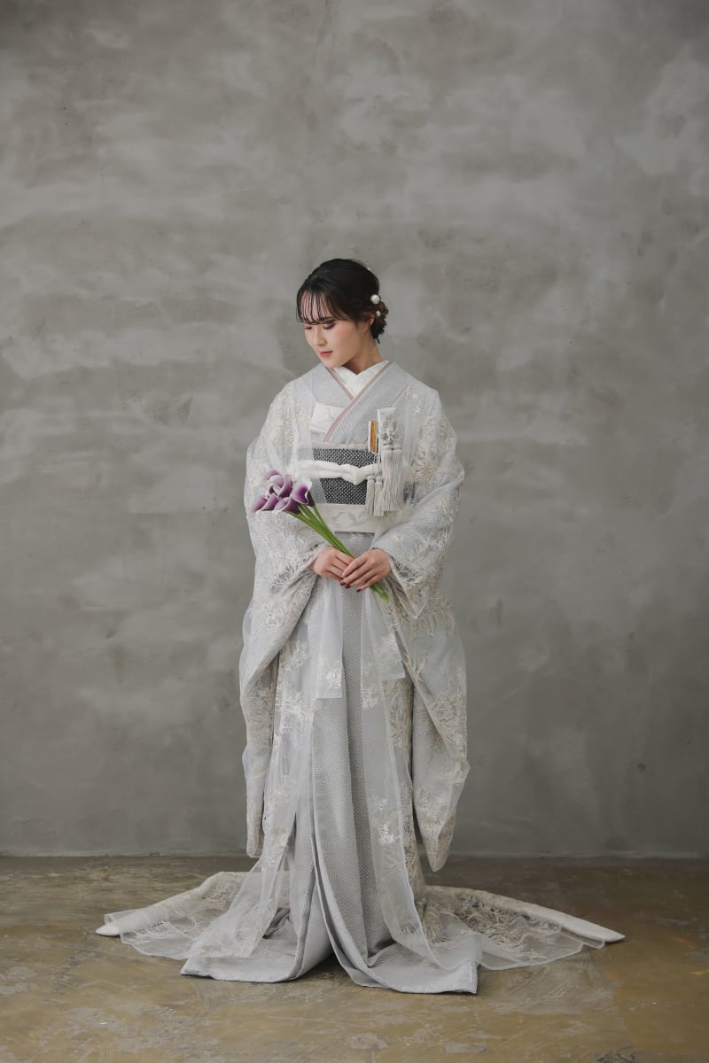 打掛が映えるようにコーディネートはシンプルにグレー系でまとめました。