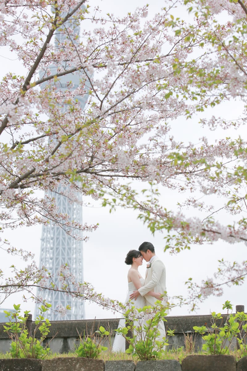 洋装で、雷門〜隅田公園の桜やスカイツリーを背景に撮影しました。