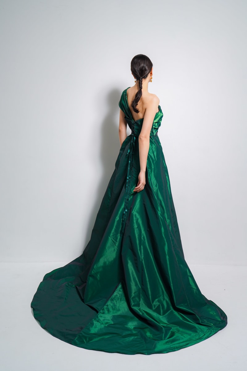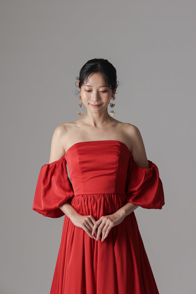胸元の特徴的かつ斬新さが目を引くドレスです。