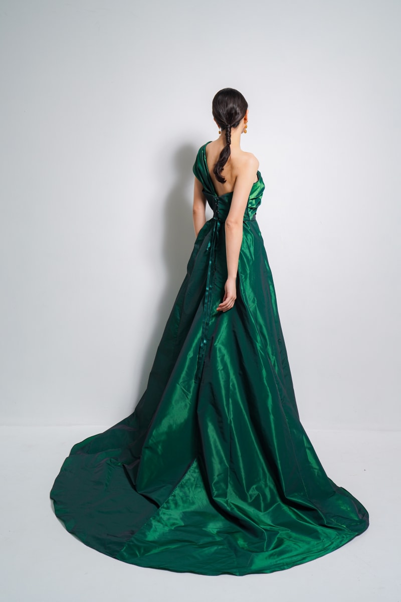 生地の綺麗な深いグリーンはたくさんのギャザーがあることにより動きがあるたび、様々な顔を見せてくれます。