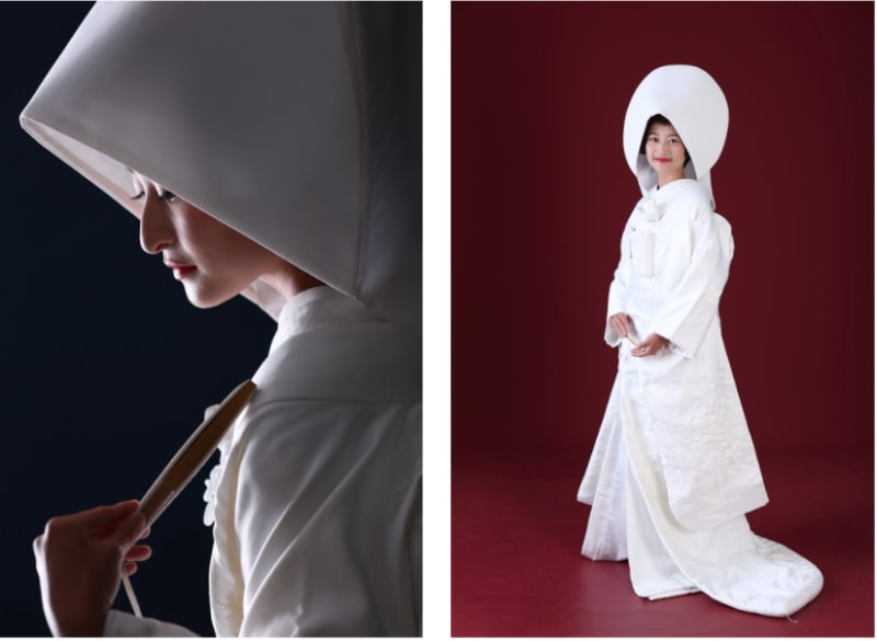 ・角隠しは、白無垢、色打掛、本振袖など幅広く使用することができる。