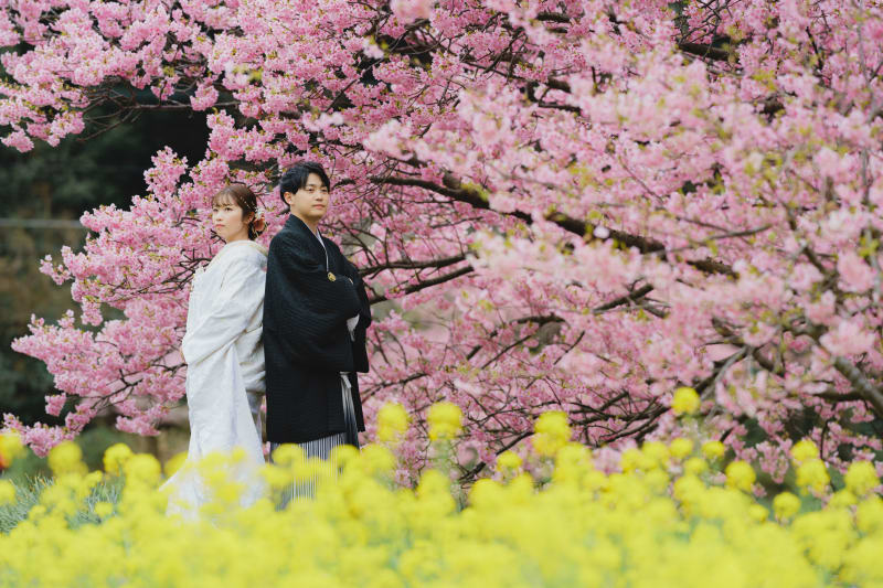 河津桜は一般的なソメイヨシノなどに比べて 濃いピンクのキレイな花を咲かせることで有名です! 綺麗なピンクの桜に囲まれて一生の思い出を作りましょう!