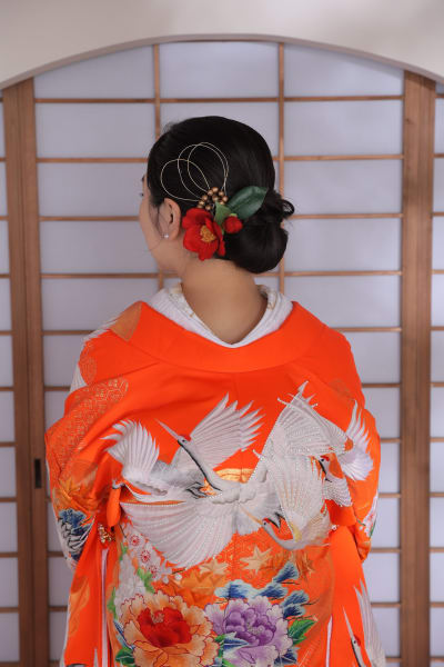 ヘアは新婦様がイエベ秋とのことでオレンジメイクでまとめて暖かみのある爽やかな印象に、ヘアはご要望のつるっとヘア!!赤や緑で飾りをまとめ、水引もつけてバランスよくしました!!