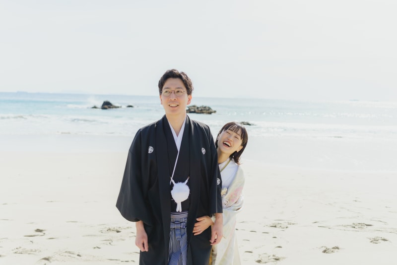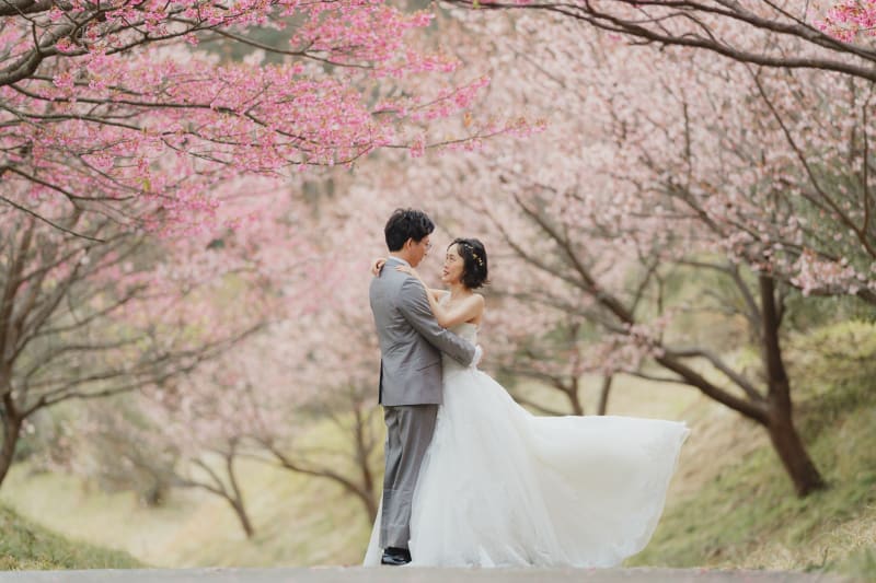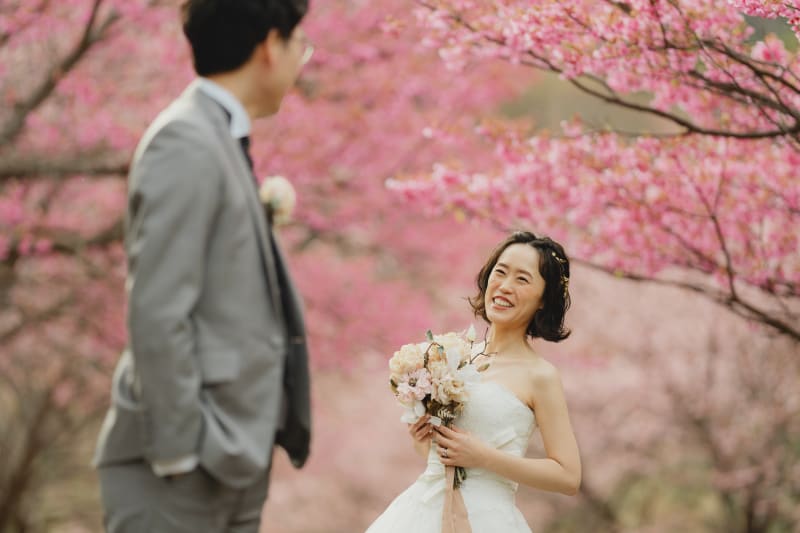 満開の河津桜の元、お二人の少し緊張した表情が微笑ましいです。