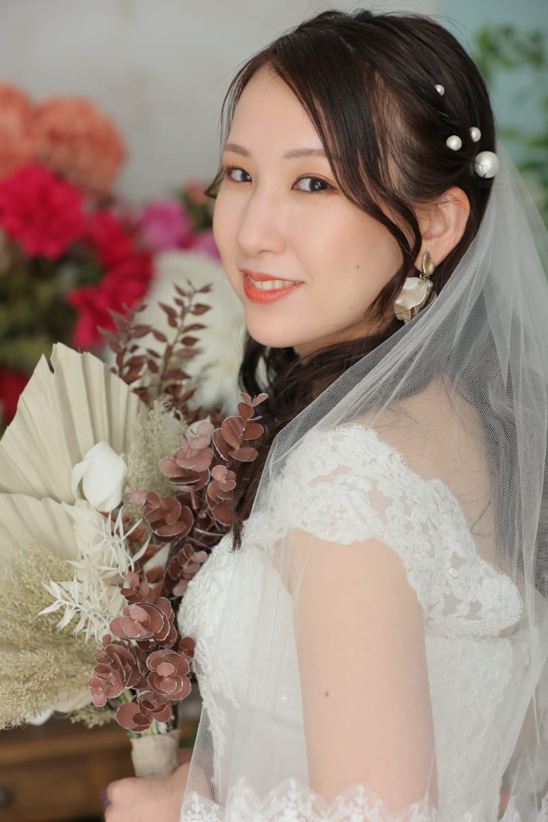 飾りはシンプルなパールピンをチョイス、ベールでより華やかな印象になります!