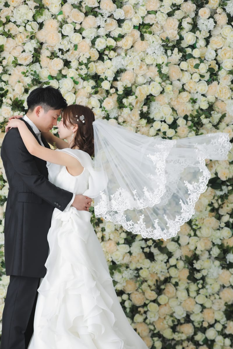 バラの背景でベールを使って美しく!! なびいたベールは躍動感があります!