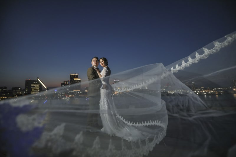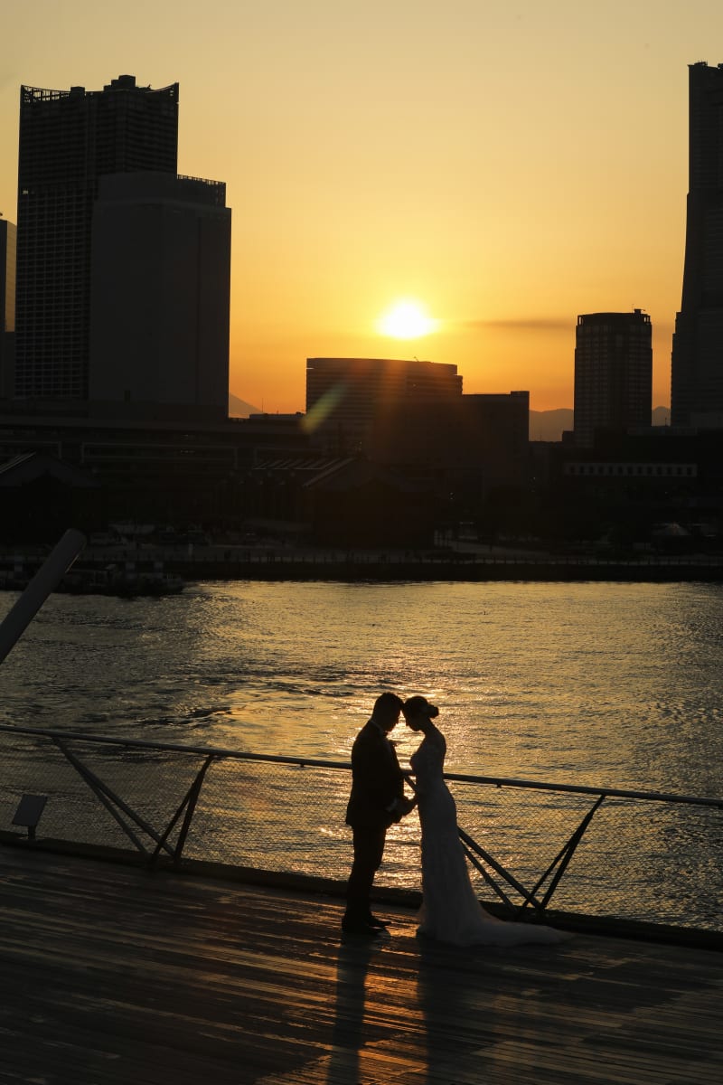 マジックアワーと呼ばれる神秘的な時間。新婦様の美しさを際立てます。
