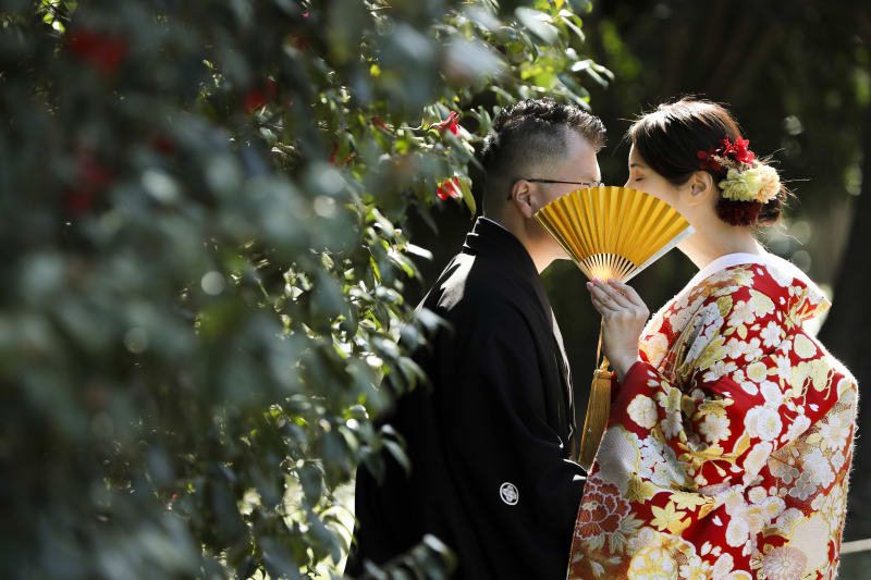 椿の茂みの向こうで扇子ショット。こちらもお二人ご希望のショットでした。