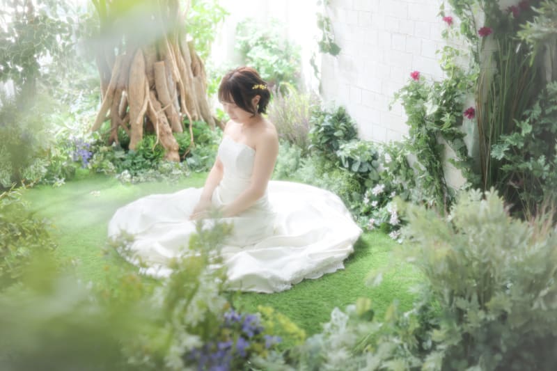 ハウススタジオにあるイングリッシュガーデンの背景で新婦さんソロカットから撮影!自分の中でサブテーマをきめました!ちなみにサブテーマはおとぎ話です!