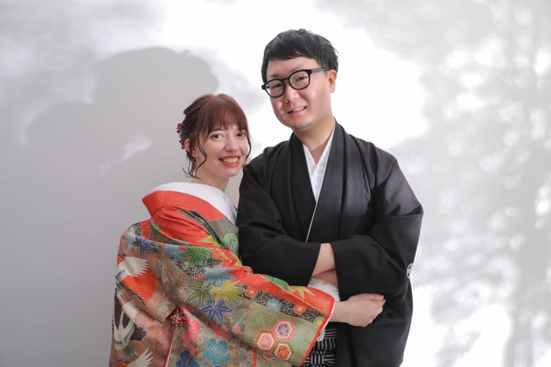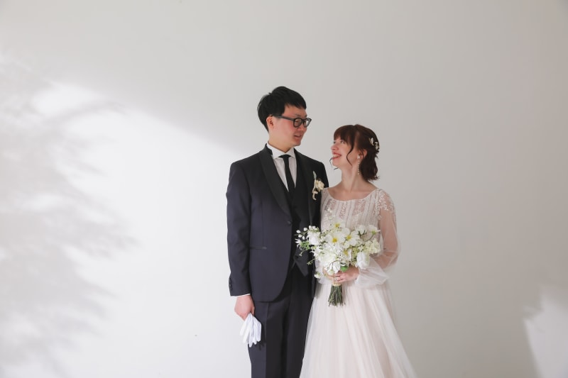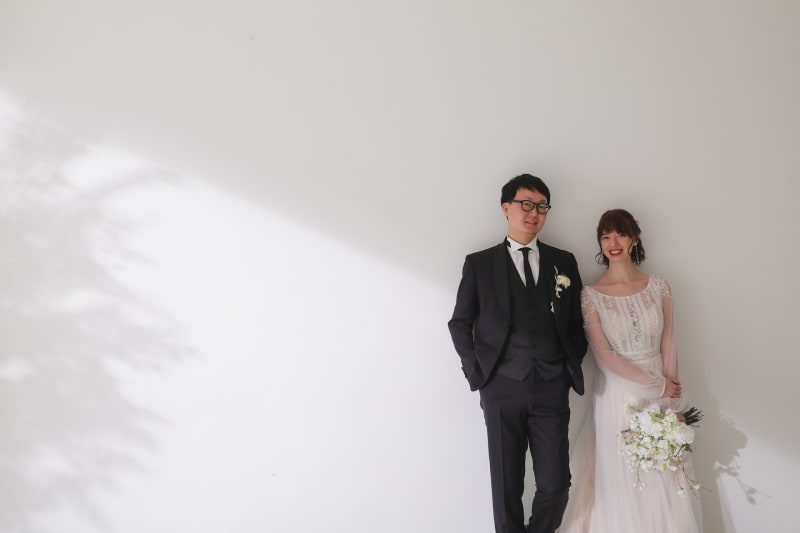 先程とはガラッと 白い背景でお二人の衣装が引き立ちます!