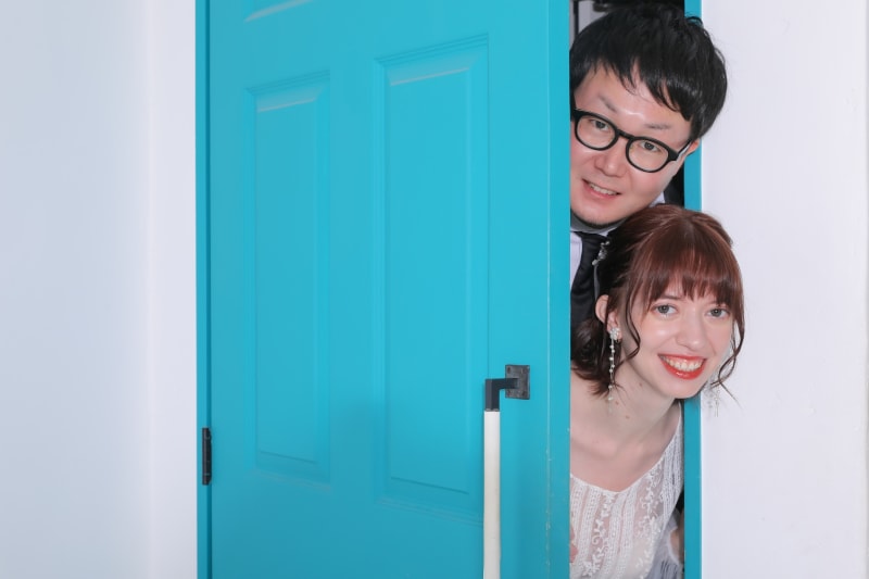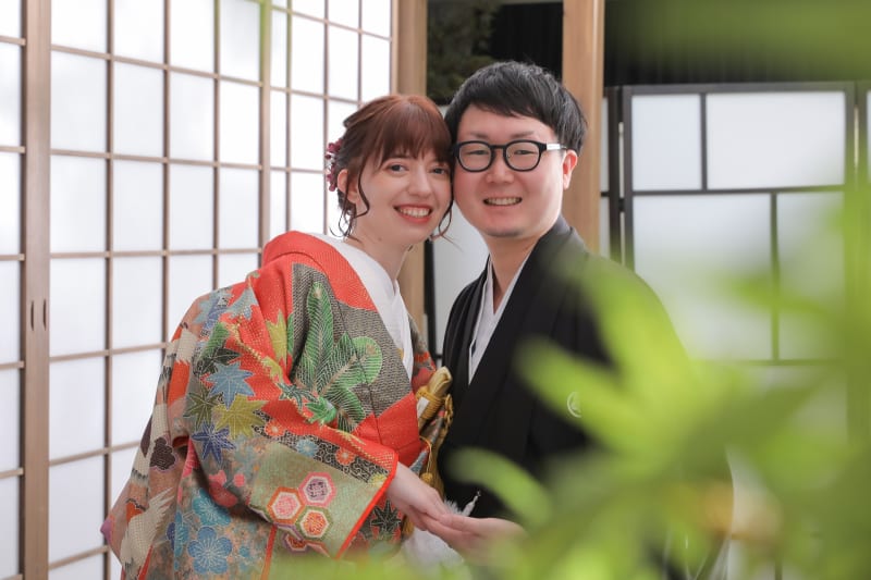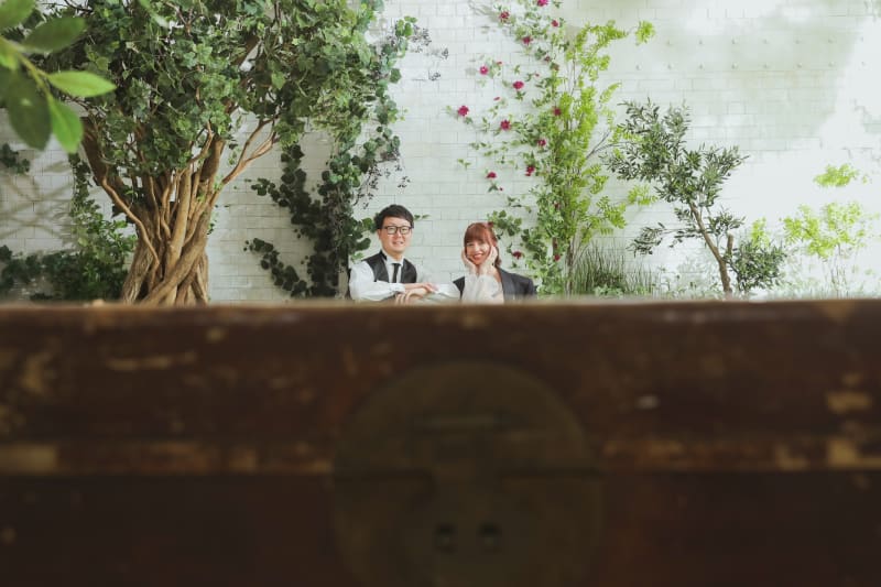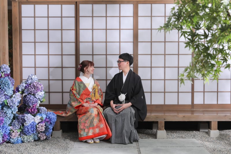 縁側で仲良くおしゃべりをしているおふたり スタジオには紫陽花、桜などがあり、季節感を出すことができます!
