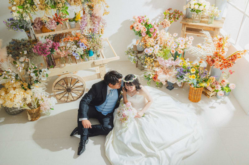 当店のスタジオではお花屋さんをイメージしたスタジオがございます。 窓から光が差し込んでくるイメージで撮影させていただきました。