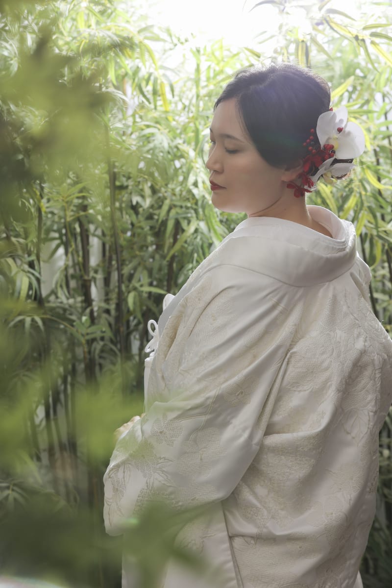 新緑に白無垢はとても引き立ちますね! 新婦様の髪飾りも和装らしく、素敵ですね
