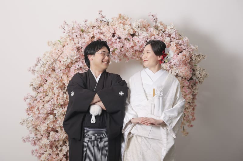 お互いのお顔を見ながら春らしい桜のアーチの前でのお写真です!