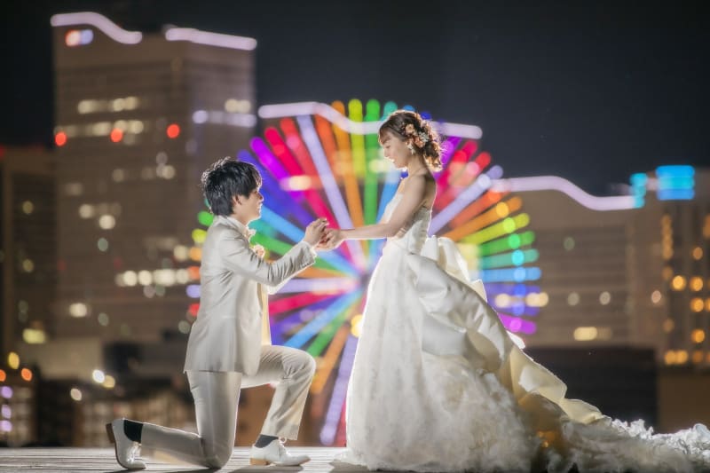 運が良ければこんな写真も撮れちゃいます!! 七色に輝く観覧車をバックにプロポーズ!!