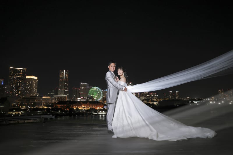 綺麗なみなとみらいの夜景をバックにベールに包み込まれたお二人を