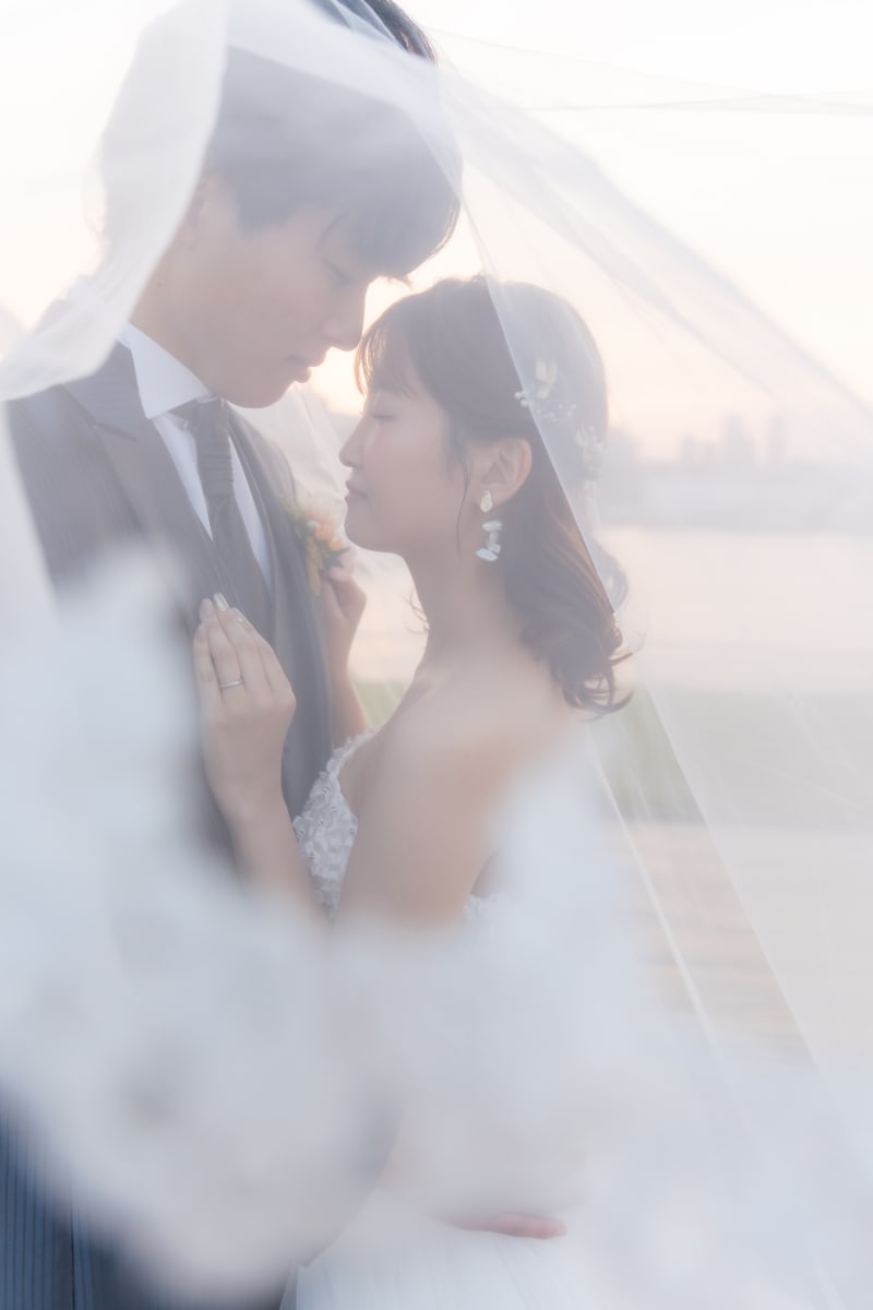 ベールの中に入って顔を近づけるお二人 新婦様が新郎様に手をあててきれいですね