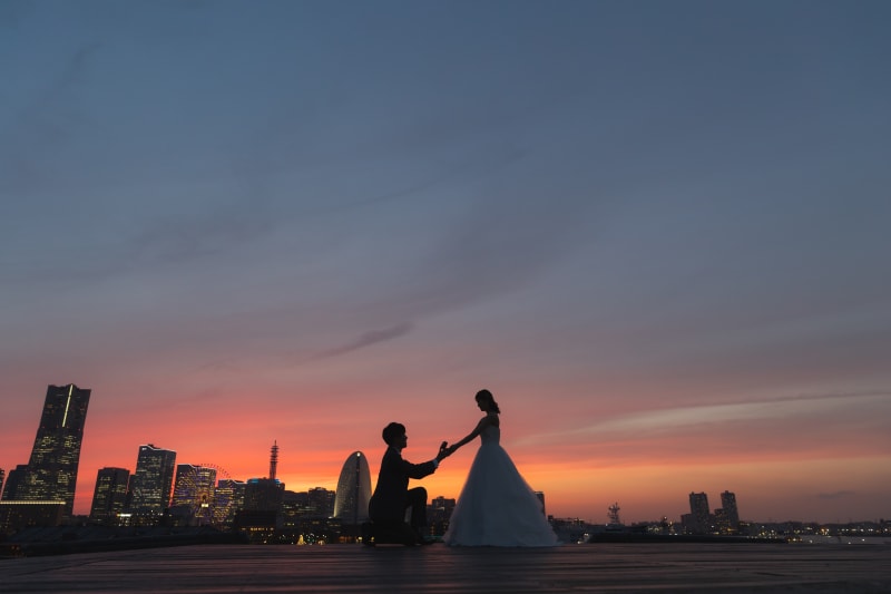 新郎様が跪いてプロポーズショットをしてくださいました! お二人のシルエットが素敵ですね!