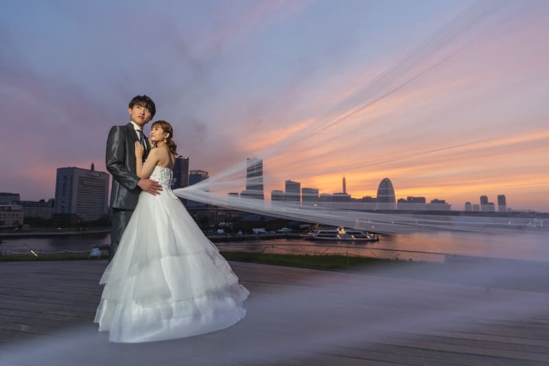 空が綺麗なグラデーションになってきました! ベールをなびかせてかっこいいお写真です!