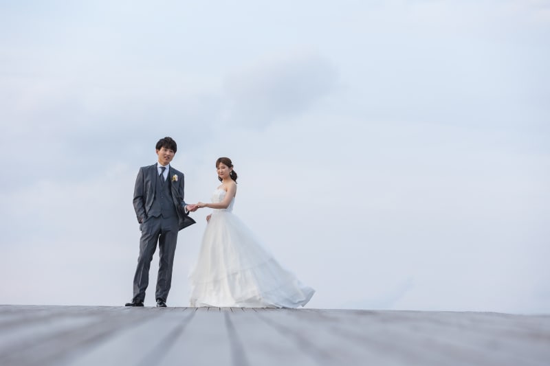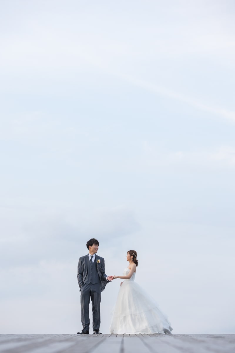 大きな空をバックに遠目からお二人を撮影! シンプルな空にお二人の姿が引き立ちますね