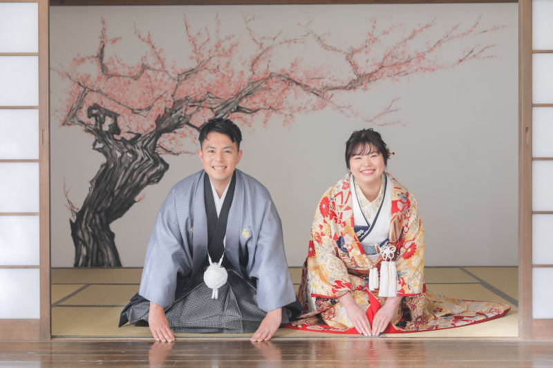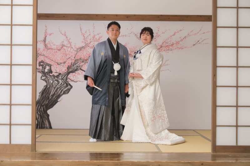 緑をたくさん使った背景もあります!新婦様の色打掛が目立ちますね!