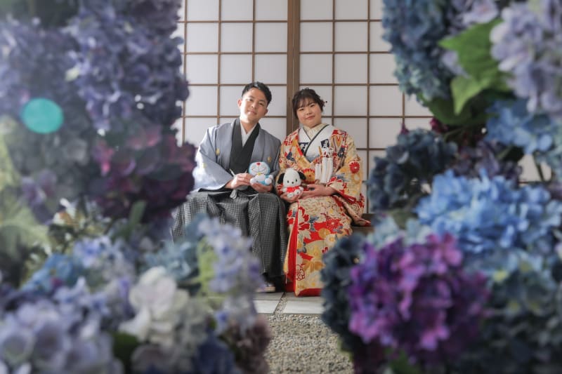 紫陽花の間から好きなキャラクターを持ったお二人がひょっこり!色々なお花が置いてあるので季節によって使い分けることもできます!